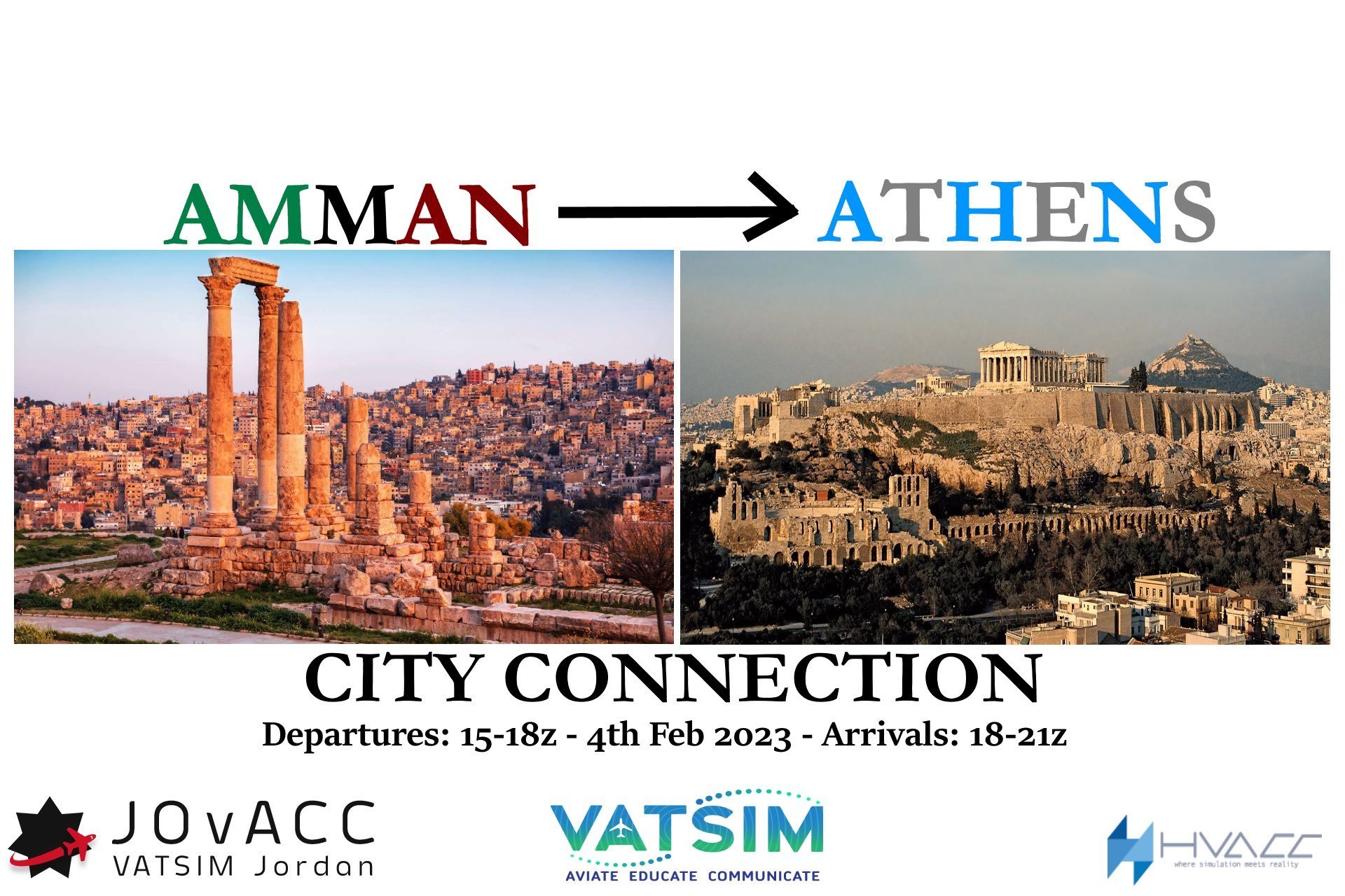 Hellenic vACC & Jordan vACC are very happy to announce their first City Connection from Amman (OJAI) to Athens (LGAV) on Saturday 4th of February 2023. Departures from Amman (OJAI) will be from 1500z until 1800z, crossing the southeast part of the Mediterranean sea and all over the Aegean sea. Arrivals in Athens will be from 1800z until 2100z. Many talented air traffic controllers will be ready to give you professional instructions all the way from your IFR clearance in Amman until the very last taxi instruction to the gates into Athens! Choose your favorite plane and get ready to experience the most blue landscape!